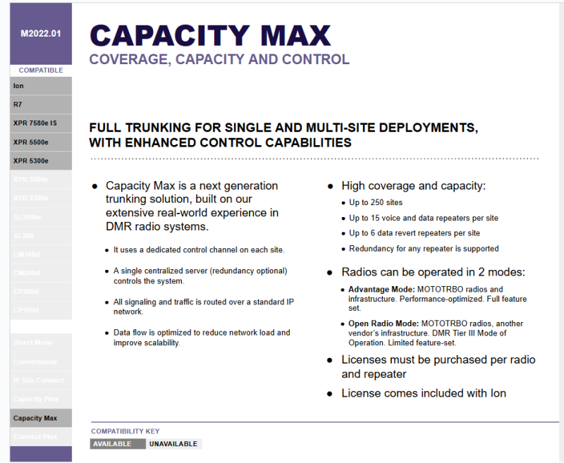 COST-EFFECTIVE COVERAGE AND CAPACITY FOR SINGLE AND MULTIPLE SITES Expand the capacity and extend the coverage of MOTOTRBO with this entry-level digital trunking system. With multi-site Capacity Plus (formerly Linked Capacity Plus) you can connect up to 15 sites, each with up to 8 voice and data repeaters - plus up to 12 dedicated data repeaters.